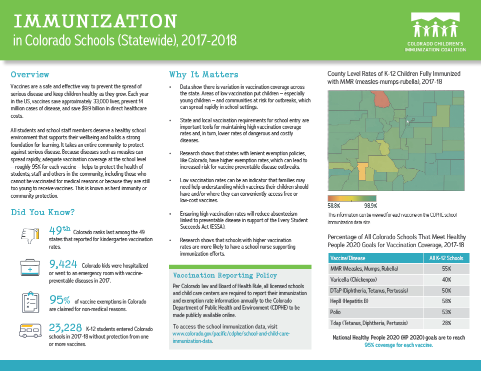 To access the 2018-2019 school and child care immunization data, visit the CDPHE website.